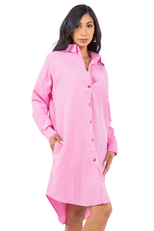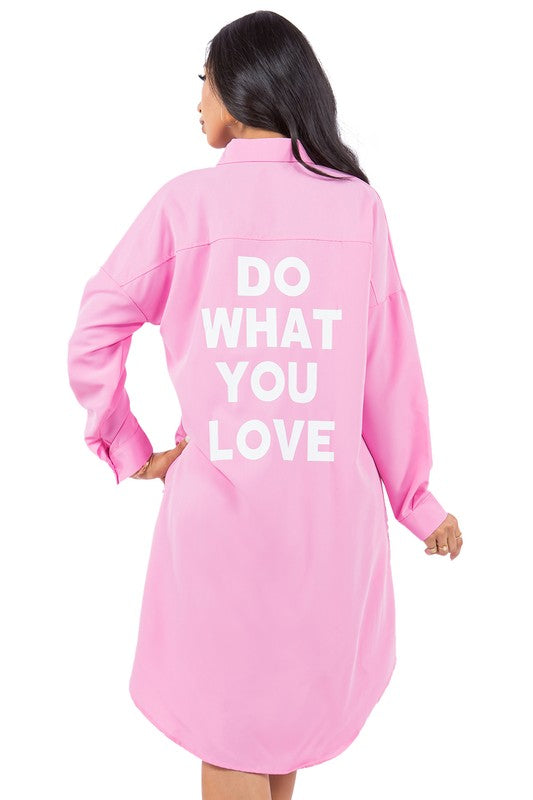 Elevate your style with the Live Fearless Fashion Shirt Dress. Featuring long sleeves, a button-down front, and a chic low-height silhouette, this dress is perfect for making a bold statement. Don't miss the eye-catching back print that adds an extra touch of flair!