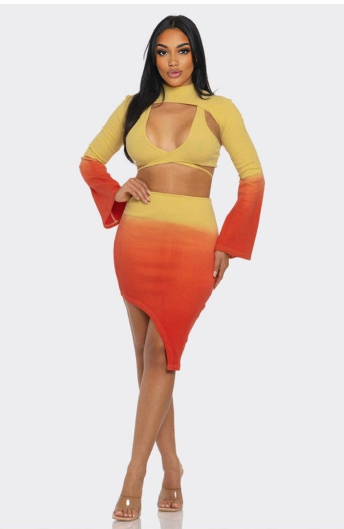 Turn heads in this sunset-inspired set, featuring a bold gradient from golden yellow to fiery orange. Cut-out details and a thigh-high slit bring a daring edge, while the high collar and long sleeves add sleek sophistication. Perfect for the confident woman ready to make a statement from day to night.