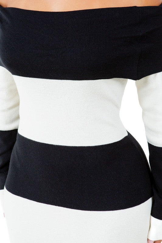 Introducing our Monochrome Muse Maxi Dress, a stylish blend of comfort and elegance. This off-shoulder sweater dress features long sleeves and a figure-hugging body-con silhouette, creating a flattering look for any occasion. The soft knit fabric ensures warmth and comfort, while the chic black-and-white design adds a modern twist.